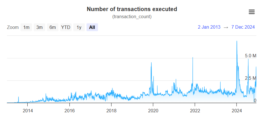 截至 2024 年 12 月 8 日,XRPL 链上日交易笔数也是维持在高位 200 万笔左右,不过不及 2024 年初的超 600 万笔的峰值(Messari 分析师认为,这可能与 2023 年底开始的铭文活动激增有关)。由于 XRPScan 该项指标自 2013 年起就有记录,我们可以再看看这些数字在 XRPL 的生命周期的地位。
