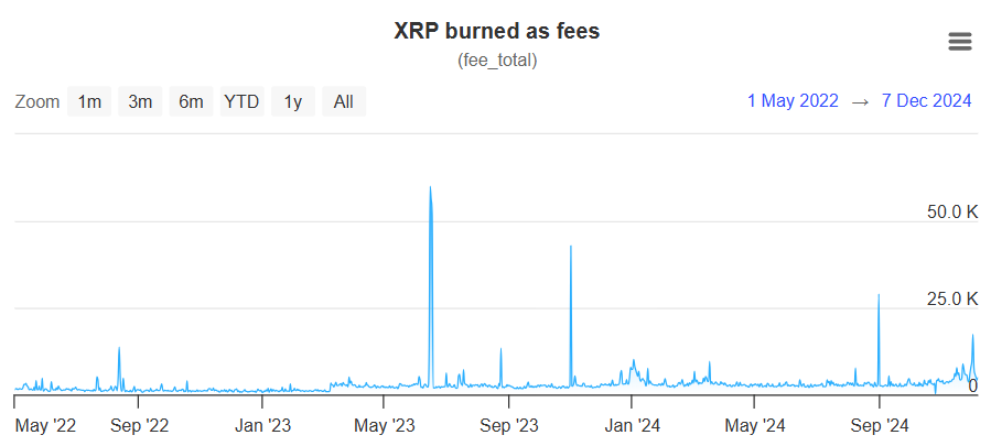 截至 2024 年 12 月 8 日,大部分时间段交易费用保持在几千 XRP 的水平,折合当时的美元价值,交易费用是非常便宜的。图中的「尖刺」发生时间段并没有对应交易笔数中的极值的出现时间,具体产生原因笔者暂时不清楚。