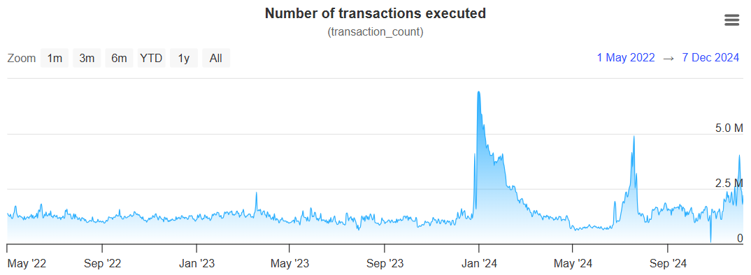 可以看到,截至 2024 年 12 月 8 日,XRPL 的最新日交易笔数总体而言还是在全生命周期的高位。峰值方面,超 600 万笔的日交易笔数已经超过上轮牛市的约 500 万笔的极值。而趋势方面,这轮牛市中也是要高出约几十万笔左右。