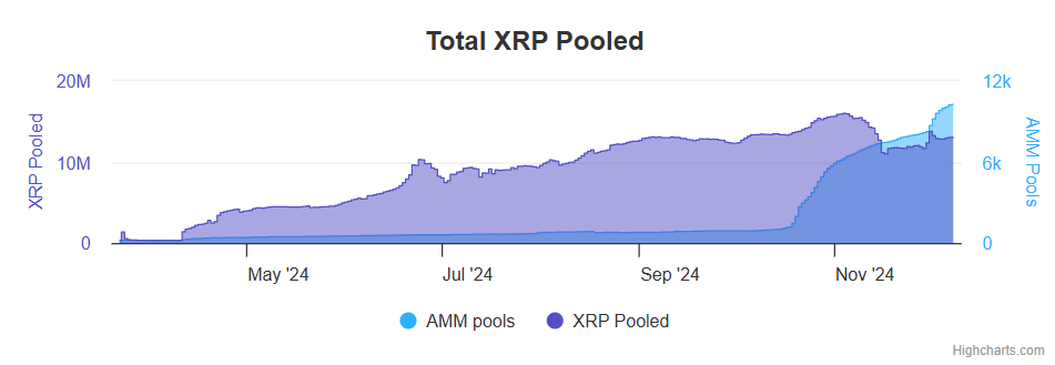AMM 池中的锁仓量要小得多,自 10 下旬开始快速增长,但 2024 年 12 月 8 日也仅达到 10K(1 万)XRP 左右。