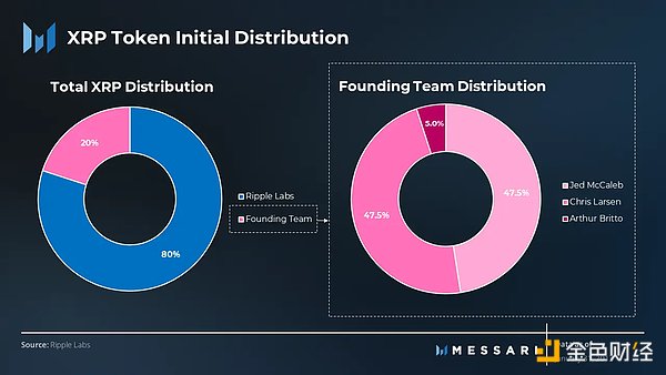 分配比例:代币的 20% 分配给三个创始人 Jed McCaleb、David Schwartz 和 Arthur Britto,80% 分配给后来的 Ripple。