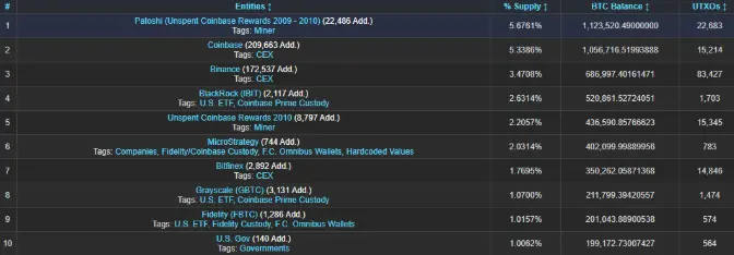 作为全球持有比特币最多的上市公司,MicroStrategy的策略一直备受关注。数据显示,目前比特币的流通量正越来越集中在少数大机构手中。中本聪之外的比特币前五大持仓实体共控制了流通量的9.9%。其中,Coinbase持有112万枚BTC,价值超过1120亿美元;币安持有68.7万枚BTC,价值近689亿美元;贝莱德、Microstrategy和Bitfinex也分别排名第三至第五位。除了中本聪之外,前十大持仓实体目前控制着约14.82%的比特币总流通量。这些机构的持仓情况直接影响了市场的走势。