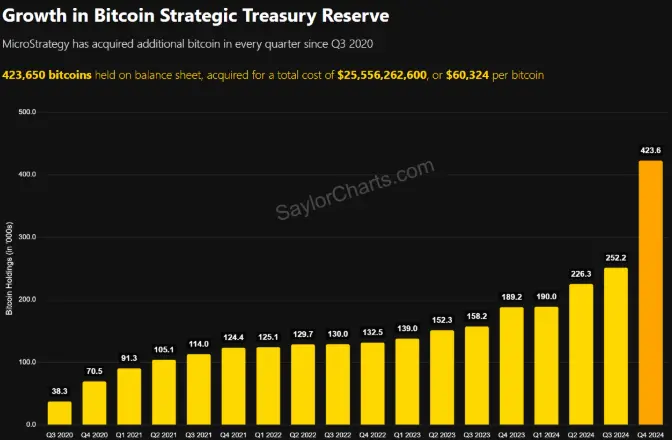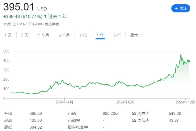 MicroStrategy的目标是利用审慎的杠杆来获取尽可能多的 BTC,提高股价,并超越比特币本身的表现。截至2024年12月8日,MicroStrategy共持有423,650枚比特币,累计投资约256亿美元,平均成本为60,324美元。今年以来,其季度BTC收益率达43.2%,年初至今的收益率为68.7%。同时,MicroStrategy的股价表现远超比特币,年内上涨613%,成为最牛的“比特币影子股”。