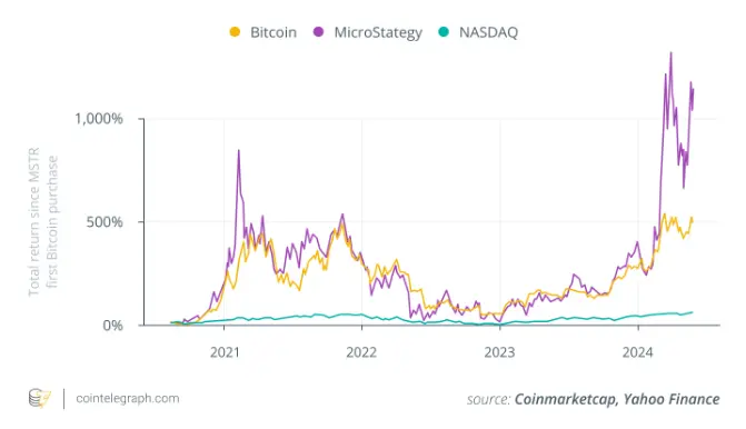MSTR的策略取得了巨大的成功。自公司全力投资比特币以来,其股价暴涨,年化回报率达到80%,股票自2020年8月以来上涨超过2600%,目前市值近930亿美元,表现远超比特币本身和其他所有主要美股。