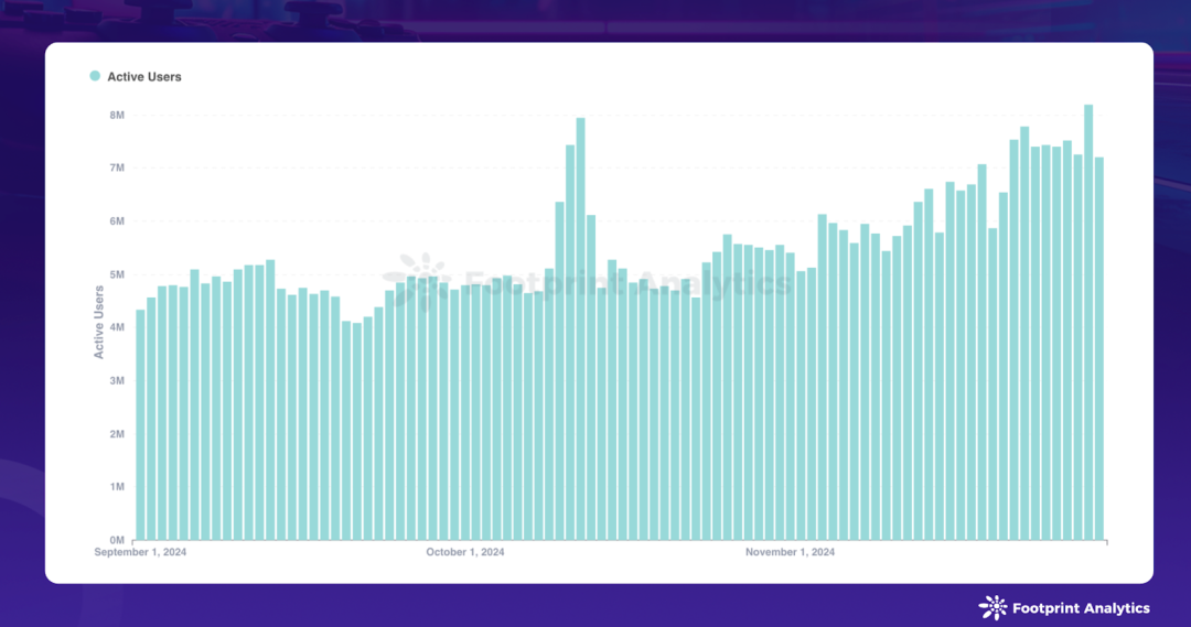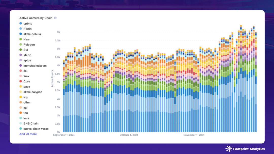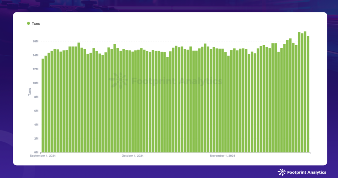 日活跃用户在 11 月再创新高,日均 DAU 达到 550 万,较 10 月增长 15.7%。这一增长主要得益于 opBNB 上持续的用户活跃度和 Ronin 生态系统的稳固表现。