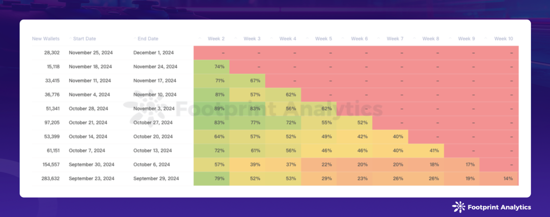 TON 游戏生态系统面临挑战,DAU 下降 41.9% 至 11.64 万,凸显了基于 Telegram 游戏的链上留存挑战。但行业总有一些例外。Sui 的 11 月平均 DAU 为 23.33 万,较上月增长 23.1%。Telegram 游戏 BIRDS 贡献了大部分用户基础,平均 DAU 为 22.49 万,其每周新用户留存率可以说是目前区块链游戏行业典范。