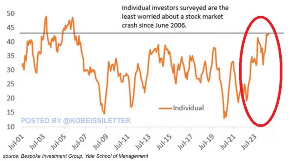 「个人投资者对市场的信心接近历史高位:46% 的美国个人投资者认为未来六个月内市场崩盘的可能性低于 10%。这一比例已达到自 2006 年 6 月以来的最高值,并在过去两年间翻了一番。(数据来源:耶鲁管理学院调查)。换言之,投资者对股市的担忧降至 14 年来的最低水平。与此同时,标普 500 指数自 2022 年 10 月触底以来已反弹约 50%。但另一方面,投资者认为当前市场估值是自 2000 年 4 月互联网泡沫破裂以来最被高估的一次。市场情绪已处于极度亢奋的状态。」
