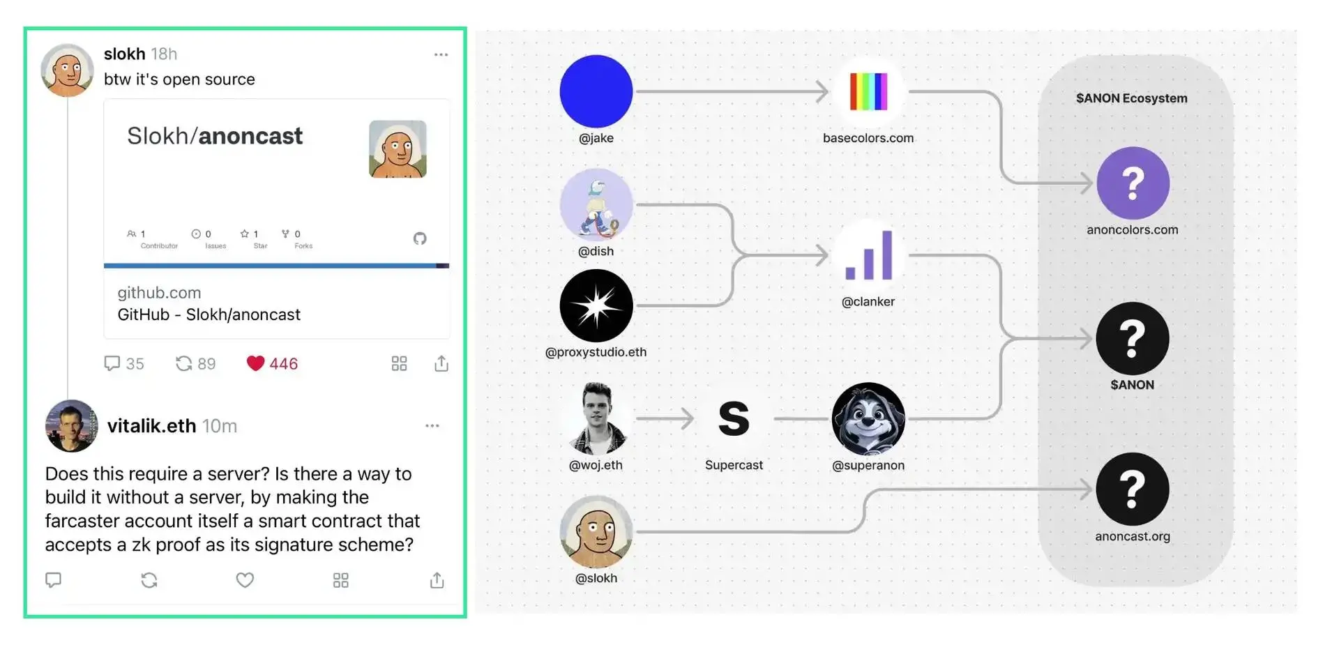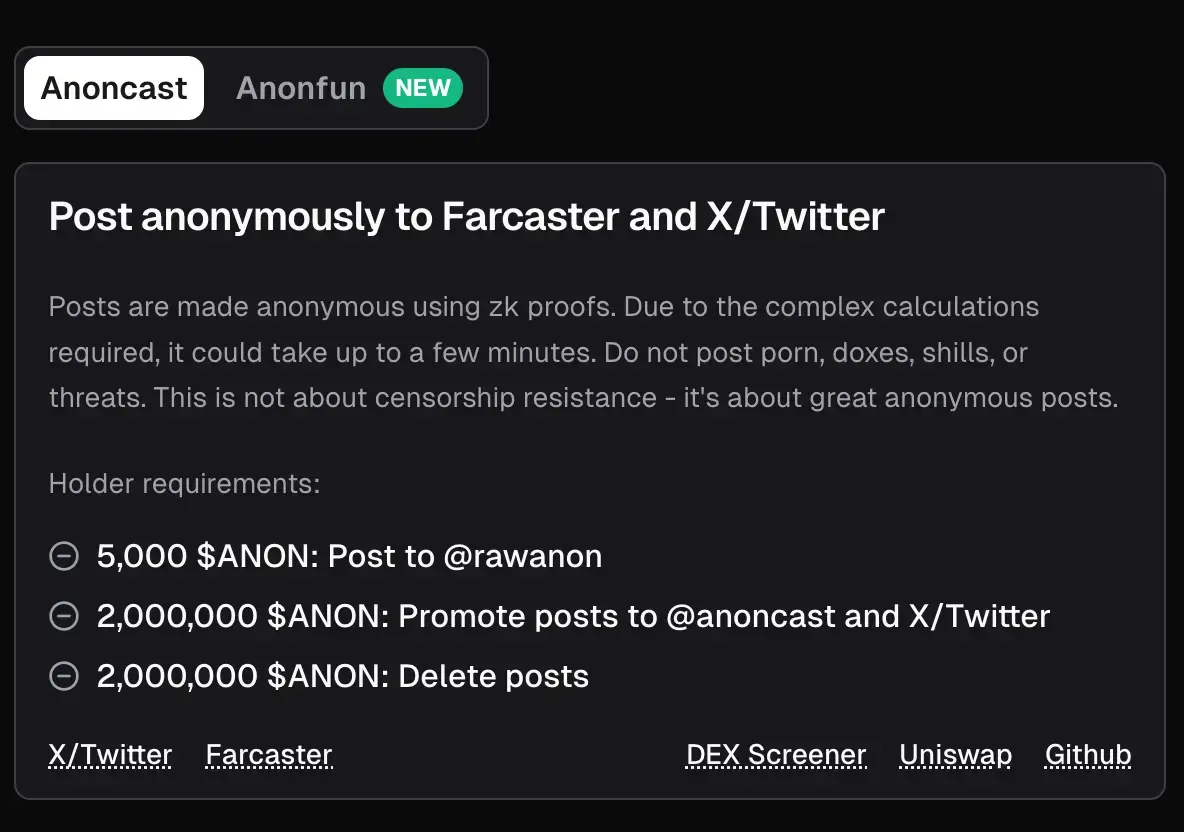 随后,开发者 slokh(曾开发 nook 客户端)构建了一个名为 anoncast.org 的平台,允许用户在拥有 $ANON 的情况下匿名发布内容。