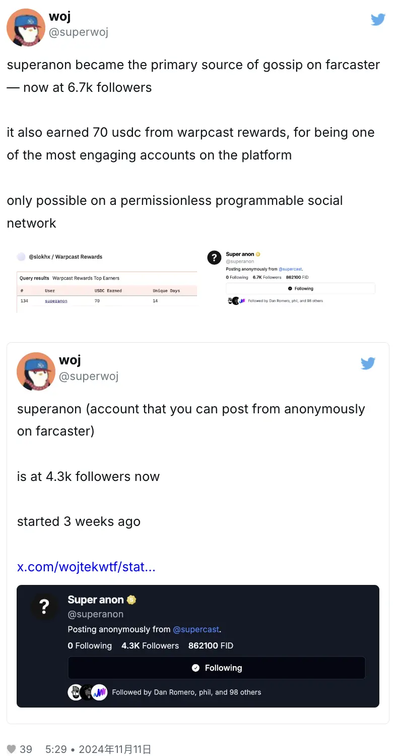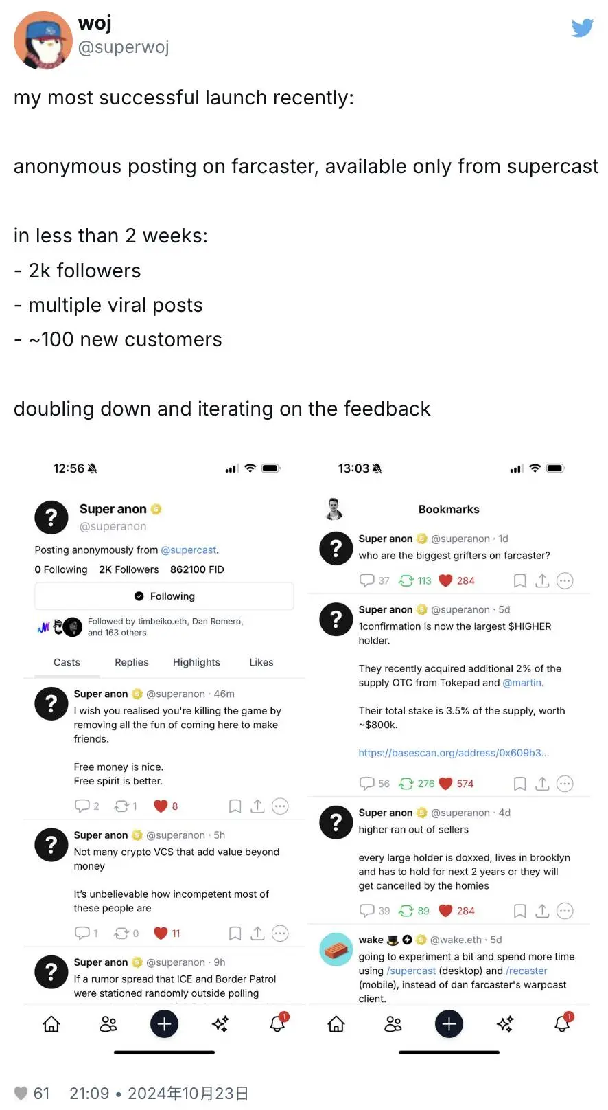 随着 Farcaster 社区的不断发展,一个名为 supercast 的高级用户客户端(由其创始人 woj 开发,后更名为 super)逐渐形成了用户群体,并催生了 superanon 的诞生。