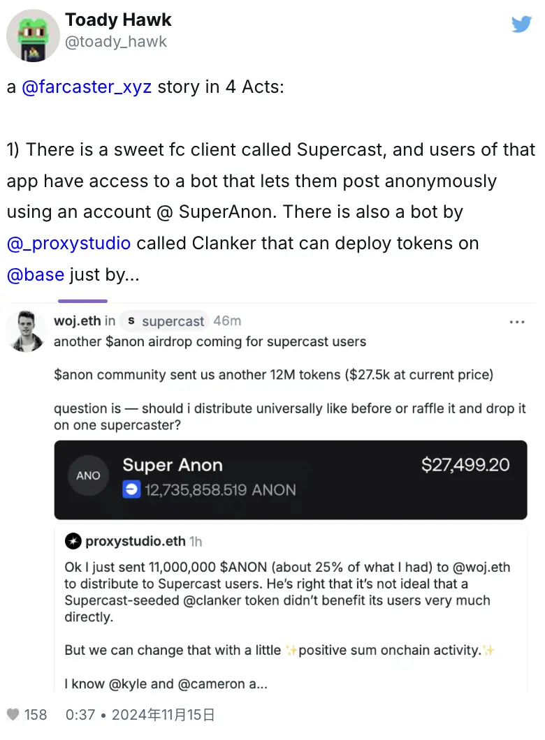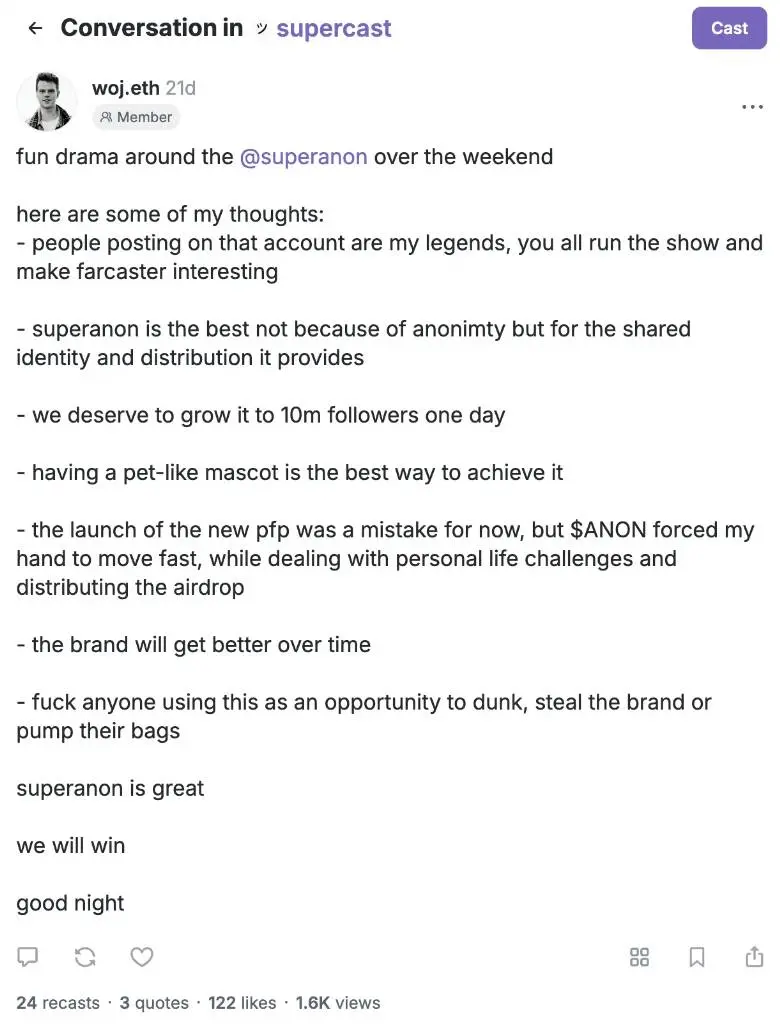 当 woj 醒来后,他正式启动了 $anon Token(无大写),作为 superanon 账户的支持工具,并通过空投将捐赠的 $ANON 分发给所有 supercast 用户。
