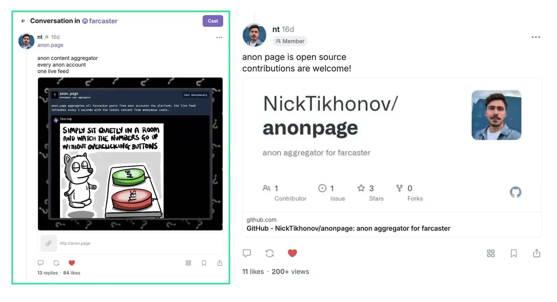 除了不断的功能更新和优化外,例如允许用户在稍后时间揭示自己是某篇热门内容的作者,Farcaster 的功能也吸引了许多知名用户,包括 Vitalik 和 Jesse Pollack 。值得一提的是,0xLuo 是右边那个功能的创作者。