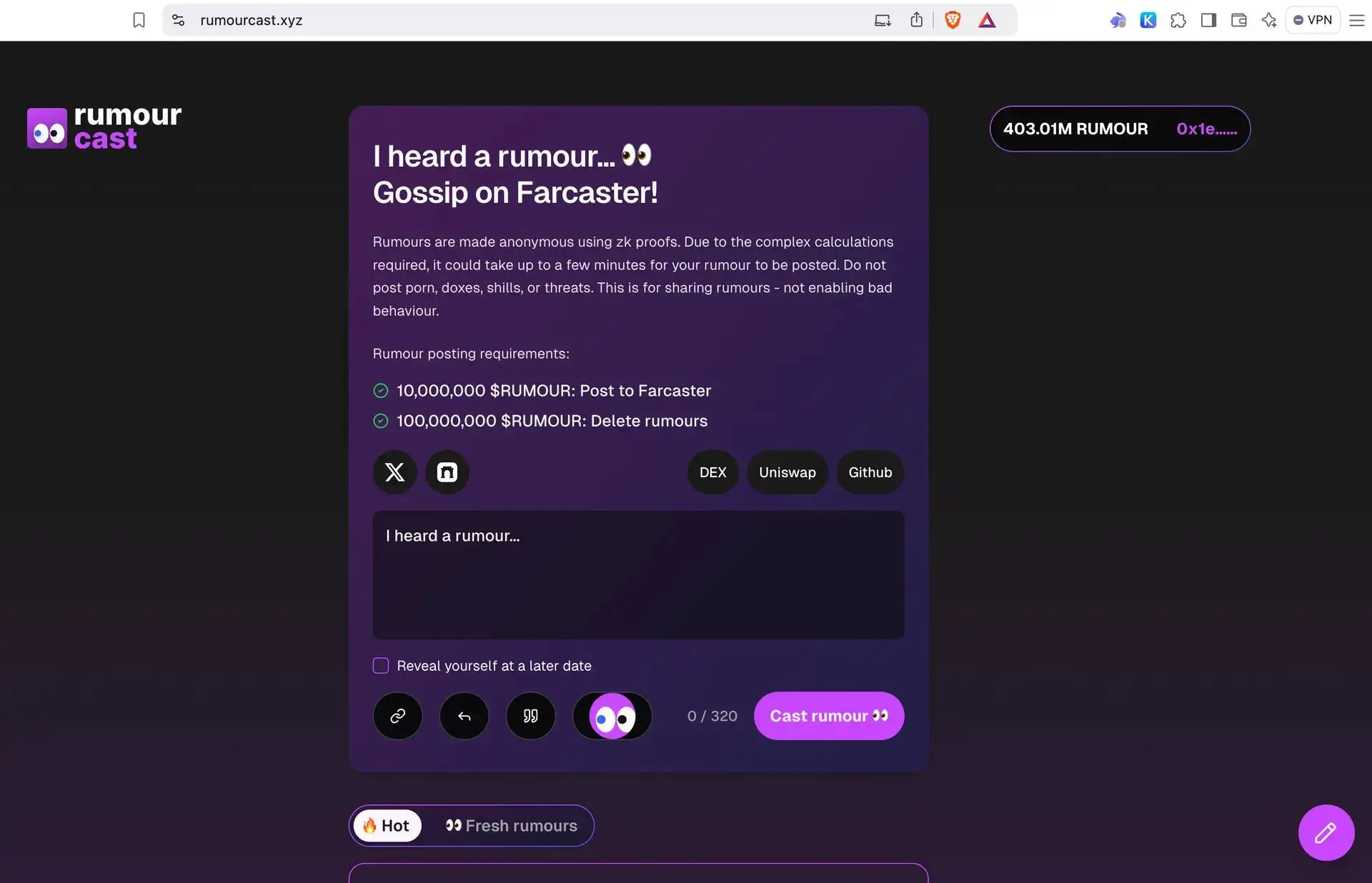 由 Disky 和 Leovido 开发的 rumourcast.xyz 是一个基于 Farcaster 协议的客户端。它以流行的 Anon Cast 为基础,但加入了一些独特的创新设计。