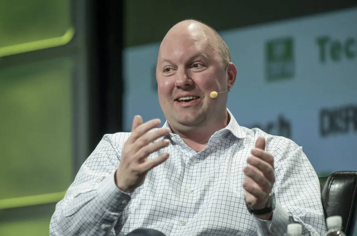 Marc Andreessen 正在坐着说话,用手做着手势,戴着头戴式麦克风