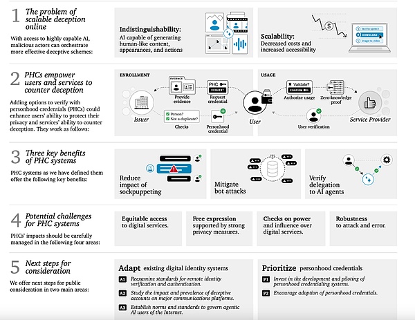 由OpenAI, Harvard Society of Fellows, Microsoft, University of Oxford, a16z crypto等多家公司的研究人员发布了探讨,一种应对这一挑战的新工具的价值:“人格证书”(Personhood Credentials, PHCs)。这种数字凭证使用户能够在不披露任何个人信息的情况下,证明自己是真实的人。