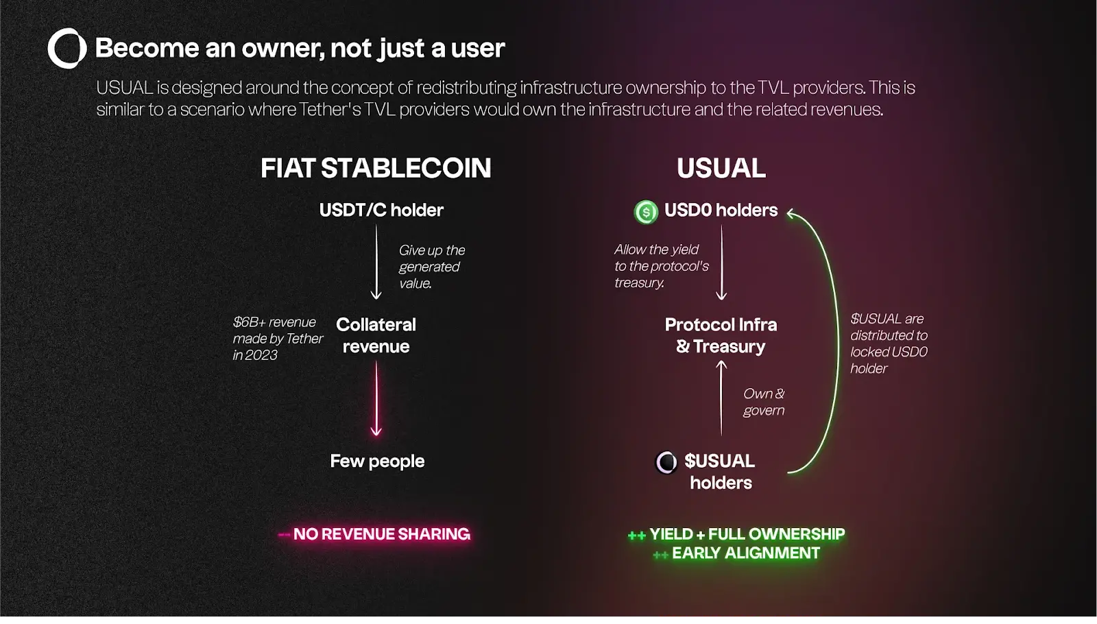 而右侧则是 Usual 的运行逻辑,其核心理念是 Become An Owner, Not Just A User.(成为所有者,而不仅仅是用户。)项目的设计也围绕这此理念进行,将基础设施所有权重新分配给总锁仓价值(TVL)提供者,也就是用户的法币都将转换为超短期美国国债的 RWA,整个实现过程则通过 USYC 进行(USYC 由 Hashnote 运营,该公司目前是较为前列的链上机构资产管理公司,由 DRW 的合伙人支持),最终收益进入协议的金库,并由协议代币持有者拥有并治理。