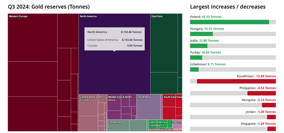 据世界黄金协会统计数据显示,截至 2024 年第三季度,美联储黄金储备总量达 8133.46 吨(约合 5300 亿美元),稳居全球首位。而 100 万枚 BTC 当前市值接近 1000 亿美元,约占美国黄金储备规模的 19%,规模可谓相当可观。
