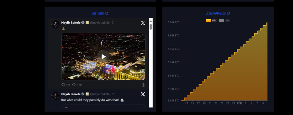 每逢加密市场剧烈波动,萨尔瓦多总统 Nayib Bukele 往往第一时间通过社交媒体发布比特币购买公告,为市场注入信心。目前萨尔瓦多保持每日买入 1 枚 BTC 节奏,在持续「抄底」加持下,截至 12 月 10 日,BTC 持仓达 5959.77 枚,持仓市值约 5.77 亿美元。