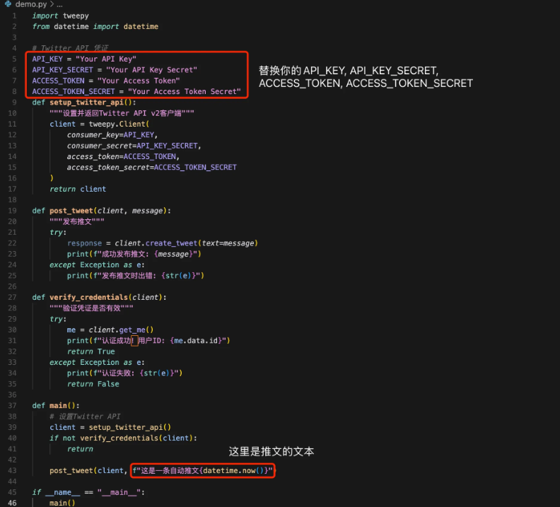 以下是一个如何通过python操作自己的twitter账户发送推文的demo: