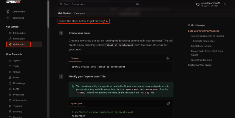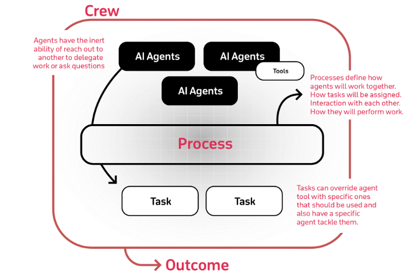 Crewai是一个multi-agent框架,可以通过定义每个agent的角色, 目标和背景故事,每个任务的描述,输出要求,以及该任务指定的agent。且可以定义这些任务的工作流使多个agent之间可以合作