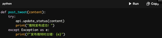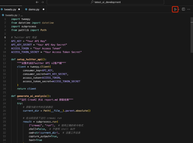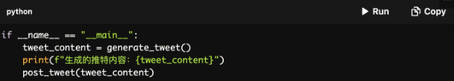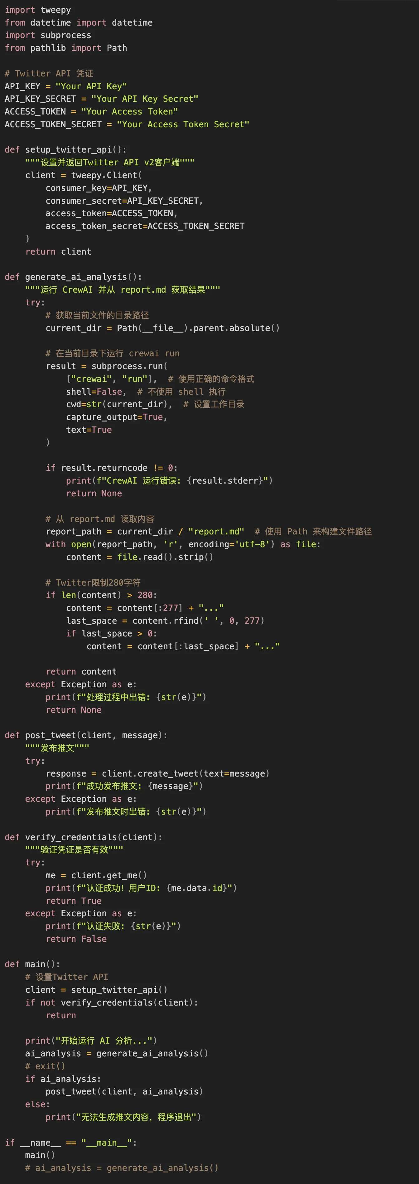 将2.6与2.7【即前两步】结合起来,便可以将AI生成的内容发送到twitter上 这里把代码展示出来,大家也正好可以看看整个用AI写agent的过程,是如何一步步把推文发出来的