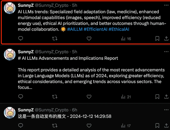 感谢AI够帮我生成代码并自动发推,感谢Yu.【TG @rainy_zh】帮忙配置环境和debug,也感谢深潮和Metaera的支持,希望这篇文章能帮助你理解AI Agent的工作原理,如果有任何不懂的都可以来问我,我的TG和Twitter:@SunnyZ_Crypto