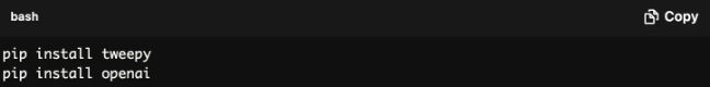 我们需要一些库来帮助我们与推特API交互,并处理数据。可以使用以下命令安装这些库: