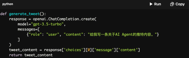 我们将创建一个函数,通过OpenAI模型生成推特内容: