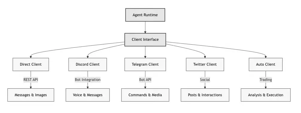 ELIZA 的客户端架构简化了平台特定实现的复杂性。通过一个标准化的接口,开发者可以以最少的额外代码在 Discord、X、Telegram 和自定义 REST API 端点上部署他们的 AI 智能体。每个客户端包都针对其相应的平台进行了定制,能够无缝管理 Discord 的语音频道集成、Twitter 的帖子调度和 Telegram 的消息系统等功能。