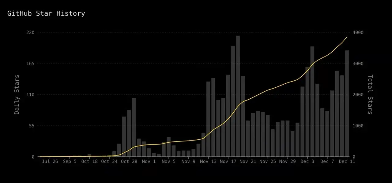 在其 GitHub 页面上,分叉和星标数量(代表开发者兴趣)呈现出接近垂直的增长,类似于经典的曲棍球棒形态。