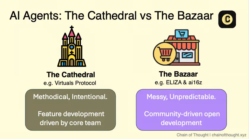 一方面,我们有大教堂的方法,由 Virtuals 等协议代表。这是一种有条不紊、集中化的设计风格,强调精确和周密的规划。我们之前详细探讨过 Virtuals 的智能体框架,并对其潜力充满期待。