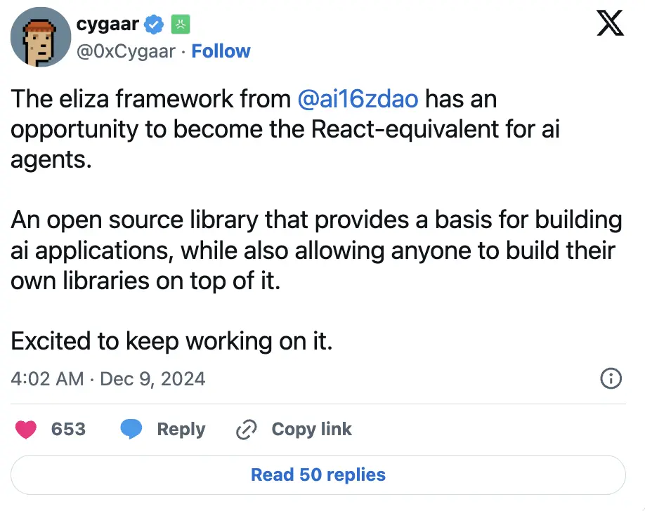 更多开发者在 ELIZA 上构建 → 框架支持更多功能(例如插件)→ 更多开发者在 ELIZA 上构建