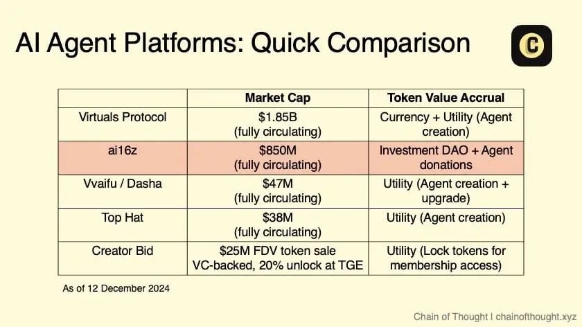 目前,Virtuals Protocol 是领先的 Web3 AI 智能体启动平台,其 Token 估值为 18 亿美元,使其成为市场领导者。相比之下,ai16z 位居第二。许多人认为,如果 ELIZA 继续推动更有用和创新的 AI 智能体的创建,ai16z 有潜力赶上甚至超越 Virtuals,即使只是单纯依靠市场认知和投资者/零售兴趣。