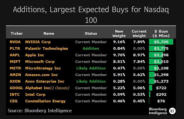 12月13日,纳斯达克官方宣布纳斯达克100指数年度重组结果。其中自称比特币开公司并在今年出现爆炸性增长的MicroStrategy(MSTR)将被添加到该指数中,并成为纳斯达克75家最大的非金融公司之一。据悉,此次添加将使纳斯达克 100 指数对比特币的敞口成倍增加,并将MSTR暴露于数十亿美元的被动投资中。目前纳斯达克100指数跟踪在纳斯达克交易所上市的最大的非金融公司包括,苹果、英伟达、微软、亚马逊、Meta、特斯拉以及好市多等主导市场的公司。
