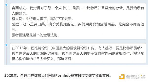 BTC 的价值在宏观领域,从金融史上类比债券、股票,是人类科技新一轮发展「燃料」;中观领域,是未来人类必然进入的数字世界的货币、也是指数;微观领域,则是新一轮法律监管落地,发币合规化,从而虹吸全世界民间投资需求。