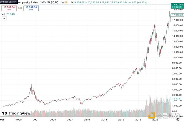 以及,回看当年波起云涌,也被众多媒体诟病「泡沫」的互联网行业。今天,纳斯达克指数突破了 20000 点大关。回过头看,2000 年的它,当时看似山峰,现在,不过是一个小山包罢了。就算在 2000 年躬身入局互联网行业,坚持到今天,依然几乎是最正确的选择。