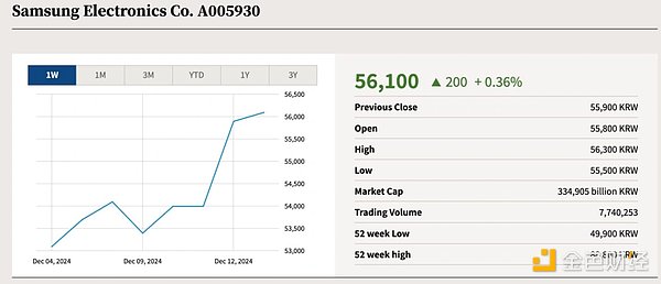 注:从图中可以看到,Doge 当前市值约为 60B 美元,三星市值约为 234B 美元,是 Doge 市值的 4 倍左右。但是 24h 交易量 Doge 达到了 5.5B,是三星的数万倍。