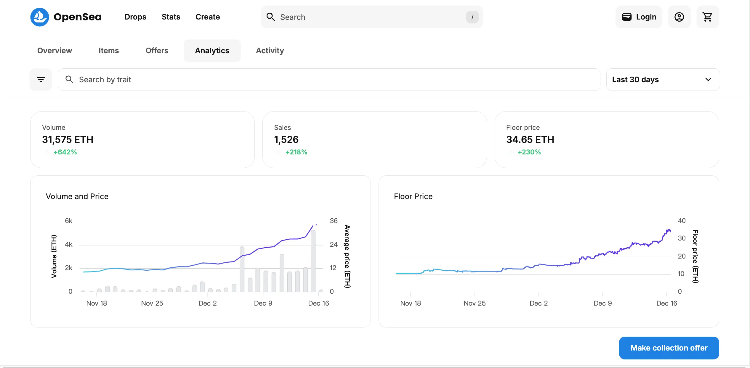 值得注意的是,Pudgy Penguins(胖企鹅)系列在本轮牛市中涨幅惊人,OpenSea 数据显示,其地板价近一月以来已从 11ETH 附近涨至 34ETH,约合人民币 98 万元;且市值达到 30 万 ETH,截止发稿前,约合 11.9 亿美元。