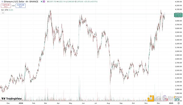 经过前几日的牛市回调阶段,ETH 价格再次站上 3900 美元。回顾这一年来以太坊的发展,有很多复杂因素和情感,一方面坎昆升级顺利完成、现货 ETF 正式通过,技术、基本面上都迎来了牛市新面貌;但另一方面随着比特币、SOL、BNB 接连突破历史新高,ETH 的价格仍在 4000 美元关口徘徊。