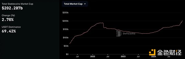 与 2021 年相比,稳定币的总供应量已经达到了最高水平,而特朗普胜选后的这一个多月,稳定币总量更是已经增发 近 250 亿美元,目前稳定币总市值达 2022 亿美元。