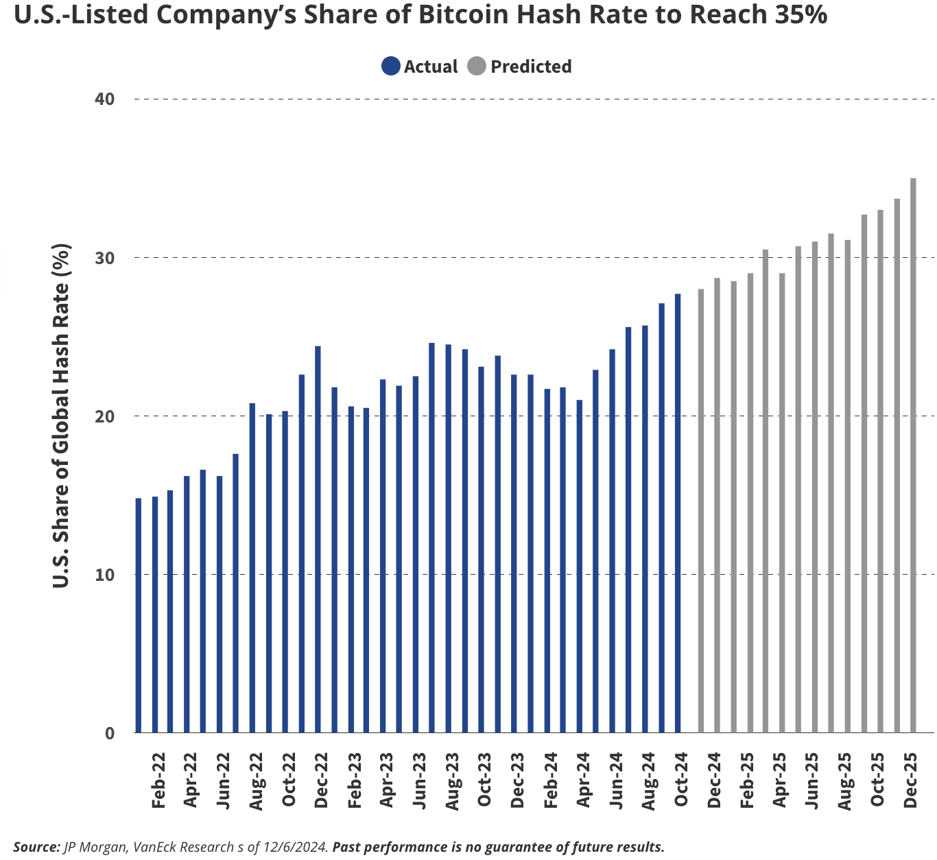 我们预计这种支持比特币的立场将波及更广泛的美国加密生态系统。随着监管的明确性和激励措施吸引人才和公司回归,美国的全球加密开发者占比将从 19% 上升到 25%。与此同时,美国的比特币挖矿活动将蓬勃发展,美国在全球挖矿算力中的份额将从 2024 年的 28% 增加到 2025 年底的 35%,这得益于廉价能源和潜在的税收优惠政策。这些趋势将共同巩固美国在全球比特币经济中的领导地位。