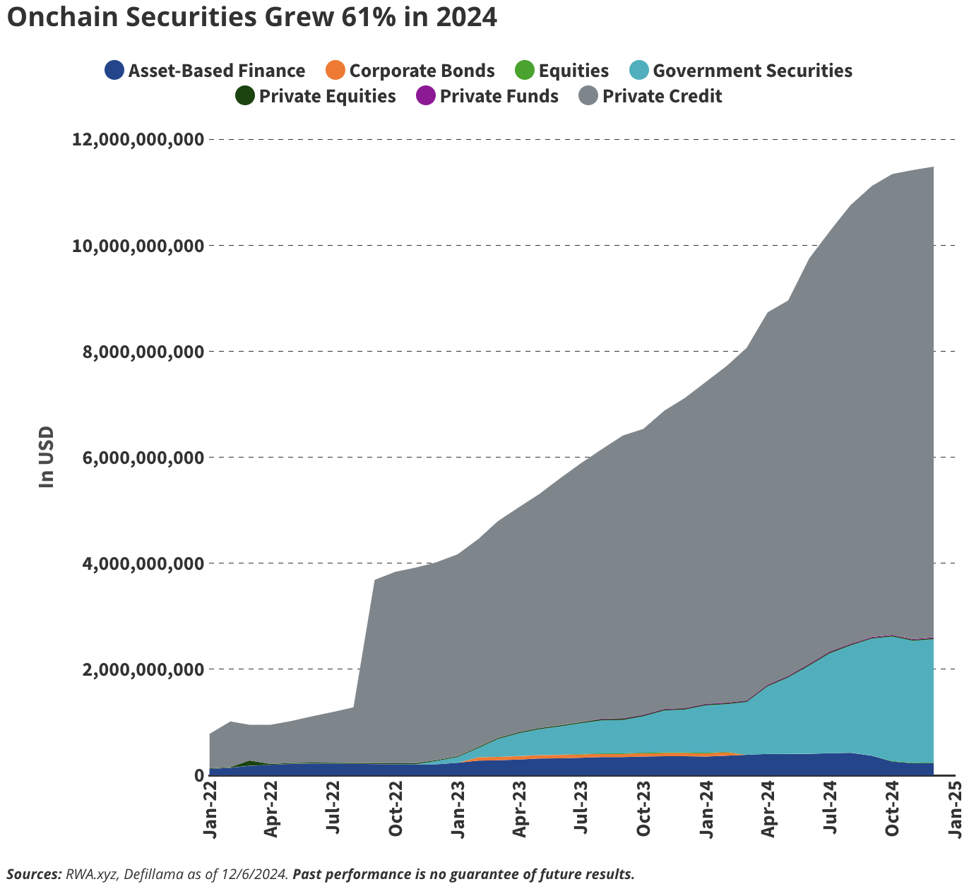 加密货币的基础设施承诺通过提高效率、去中心化和更大的透明度来改善金融系统。我们相信,2025 年将成为代币化证券爆发的一年。目前,区块链上已有约 120 亿美元的代币化证券,其中大部分(95 亿美元)是 Figure 的半许可区块链 Provenance 上的代币化私人信贷证券。
