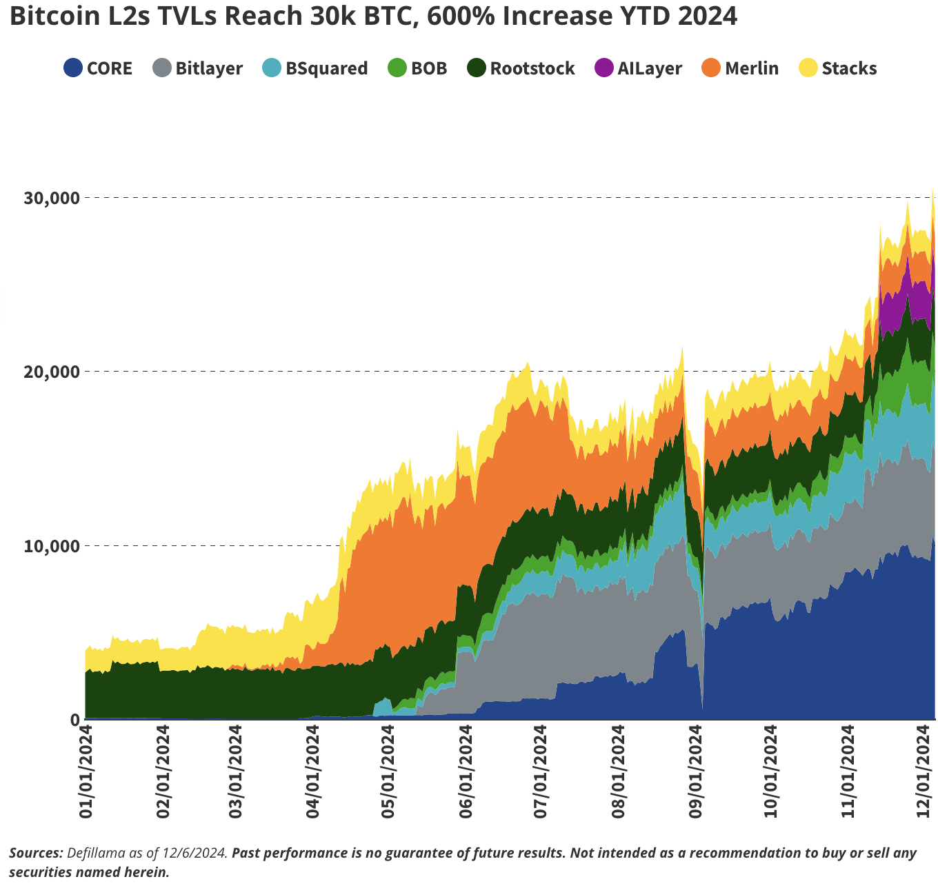 如图所示,比特币 L2 解决方案在 2024 年经历了爆炸性增长,总锁仓价值 (TVL) 超过 3 万 BTC,同比增长 600%,相当于约 30 亿美元。目前,有超过 75 个比特币 L2 项目正在开发中,但只有少数可能在长期内实现显著的采用。