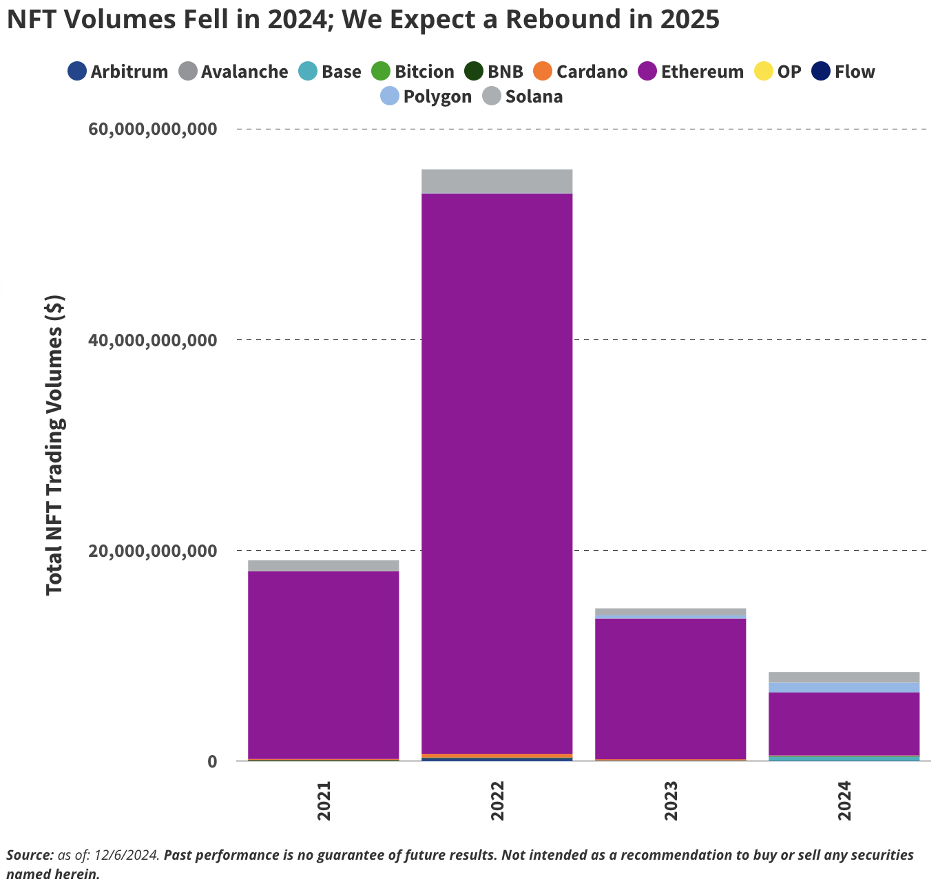 尽管 NFT 交易量可能不会回到以前周期的狂热高点,但我们认为 300 亿美元的年度交易额是可行的,约为 2021 年峰值的 55%。市场正在从投机炒作转向可持续性和文化相关性。