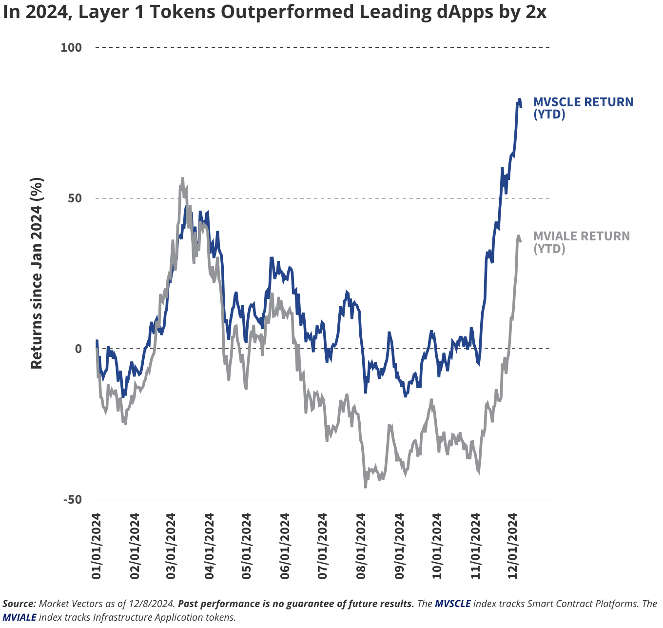2024 年牛市的一个持续主题是 Layer-1 (L1) 区块链代币相对于去中心化应用 (dApp) 代币的显著超额收益。例如,追踪智能合约平台的 MVSCLE 指数年初至今上涨了 80%,而应用代币的 MVIALE 指数同期仅上涨 35%。