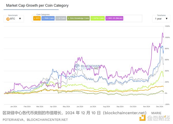 根据 Blockchain Center 的数据,在 2023-2024 年涌现的新技术中,BRC-20Token 表现最佳。虽然一些人并不将其视为真正的山寨币,但借助 Ordinals 或 Runes 等技术,这些基于比特币区块链发行的 Token 年内涨幅已超过 1000%。在更传统的山寨币类别中,RWAs(真实世界资产的 Token 化)以 717% 的年增长率领跑,包括真实世界资产的 Token 化版本及其支持协议。紧随其后的是与人工智能相关的 Token(+513%)以及 DePIN(去中心化物理基础设施,+303%)。